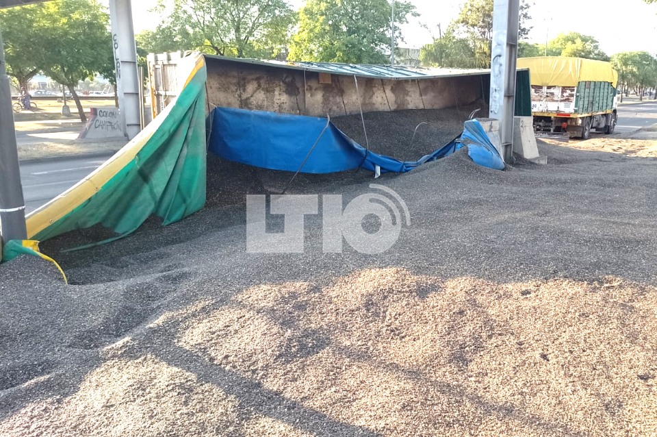 Según detallaron al móvil de LT10, el camión tenia como destino la ciudad de Rosario, y al tomar la curva a alta velocidad, se desengancho el acoplado y toda la carga de girasol se cayó al piso.