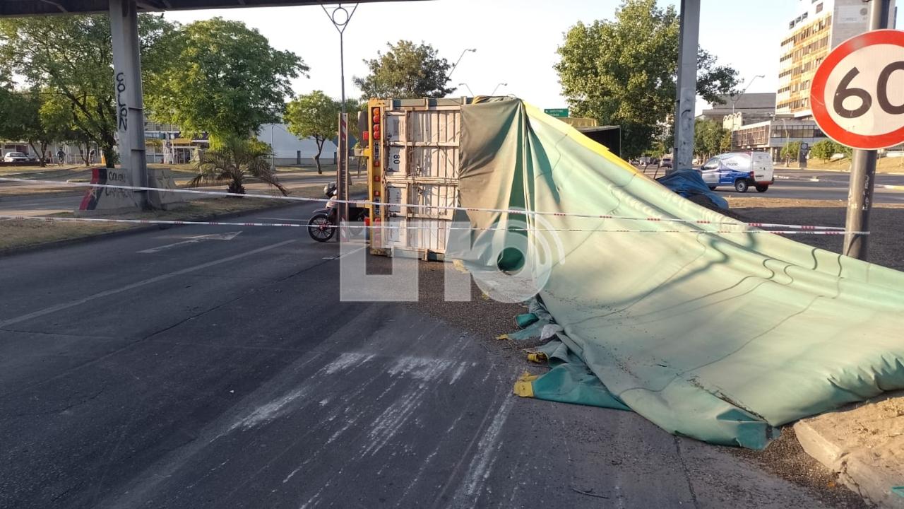 Esta medianoche en la intersección de Avenida Alem y Tucumán un camión que venía desde la ciudad de Reconquista volcó su acoplado, dejando toda su carga sobre la cinta asfáltica.