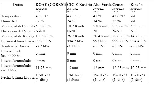 En tanto los registros de la municipalidad marcaron una tempertura máxima de 44 grados en la siesta santafesina en el centro de la ciudad. A las 16 horas el reporte del CIC de Facundo Zuviría Registró 43.1º en el norte.