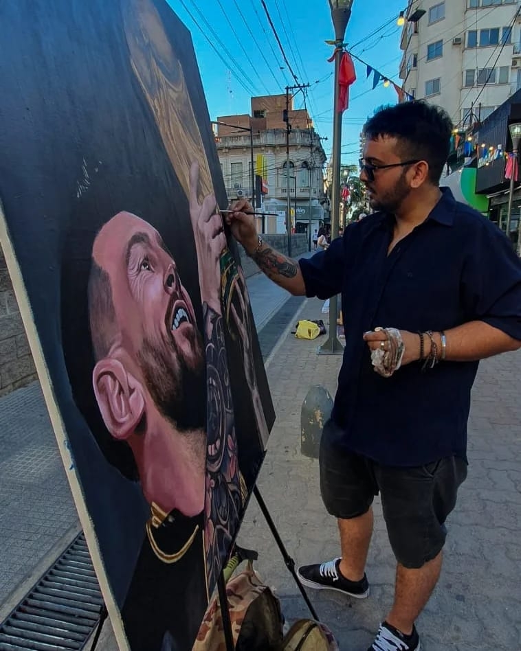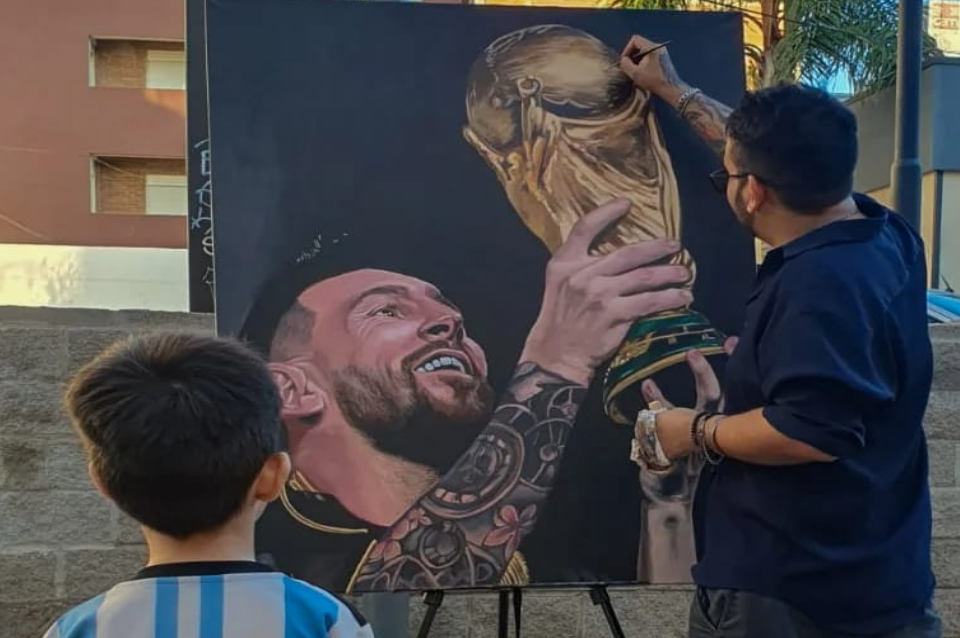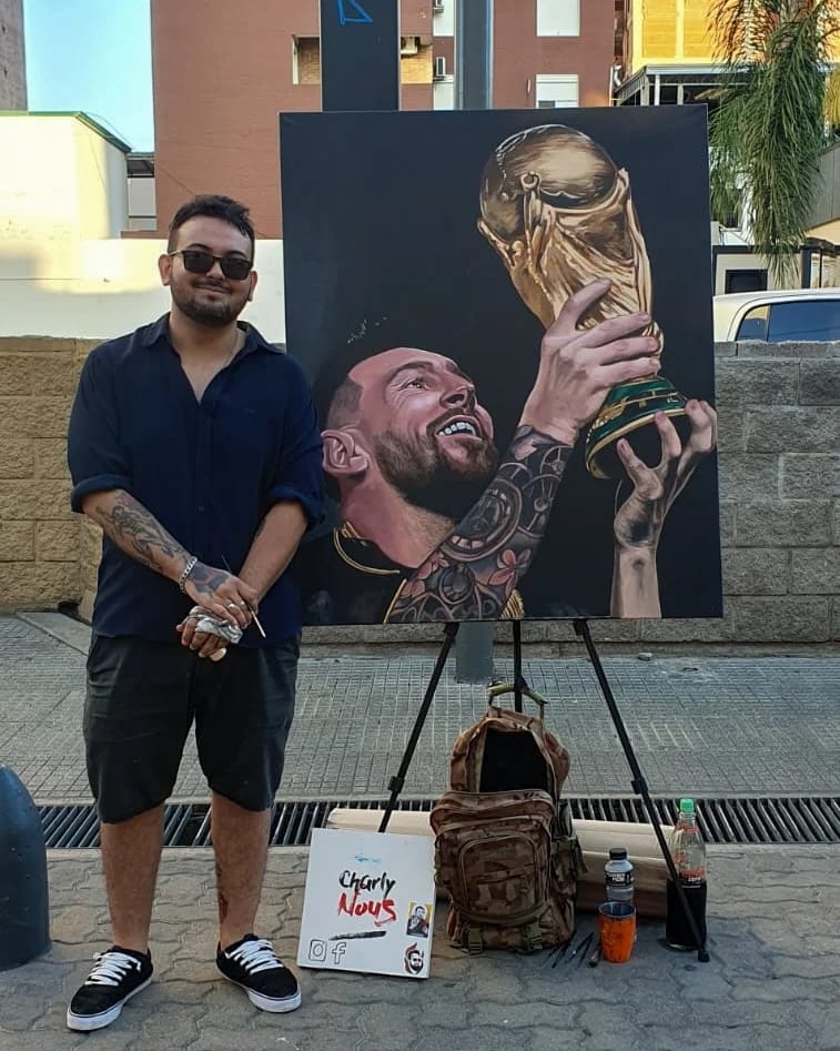 Charly Nouss es un artista santafesino y recorre las calles de la ciudad con una de sus obras que más repercusión internacional tuvo. Pintó a Messi levantando la copa del mundo casi en tiempo real. Se trata de una inspiración que confluyó en un cuadro realista de tamaño grande.