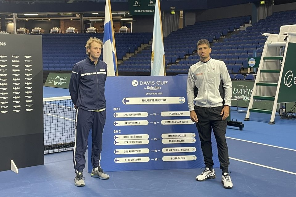 El cordobés Pedro Cachín, debutante, enfrentará este sábado a Emil Ruusuvuori en el partido que dará inicio a la serie de Copa Davis entre Argentina y Finlandia en la ciudad de Espoo, según lo determinó el sorteo del orden de juego efectuado este viernes para la eliminatoria válida por los Qualifiers 2023.