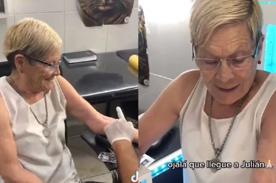 "Llevamos a mi abuela a que cumpla el sueño de su primer tatuaje por Julián Álvarez", comienza el video. "Si me ves llorar, no es de dolor sino de emoción", explicó la mujer antes de que comenzaran los pinchazos.