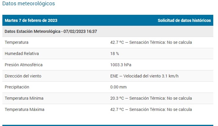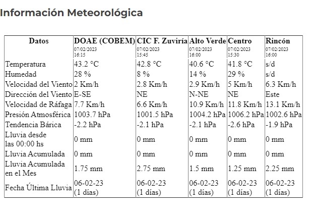 Para el miércoles se espera el pico de calor con 42 grados de máxima y una mínima de 24. Cielo algo nublado a parcial nublado. Condiciones estables, a leve inestables. Baja probabilidad de ocurrencia de precipitaciones aisladas en la tarde/noche. Vientos moderados predominantes del sector nor/noreste, rotando a moderados del sector sur/suroeste.