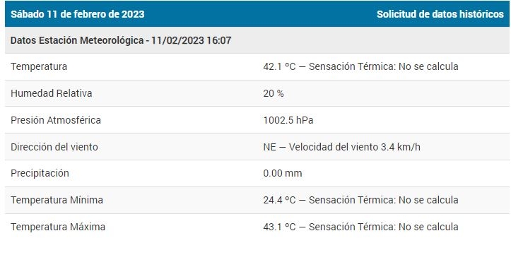 La ola de calor se hace notar y en nuestra ciudad se registró un pico de 43,1 grados en la tarde de este sábado. La máxima, según el Centro de Informaciones Meteorlógicas de la UNL se registró a las 16:07 marcando una baja humedad del 20% con vientos del noreste.
