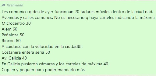 "Les comunico que desde ayer funcionan 20 radares móviles dentro de la ciudad. Avenidas y calles comunes. No es necesario que haya carteles indicando la máxima".