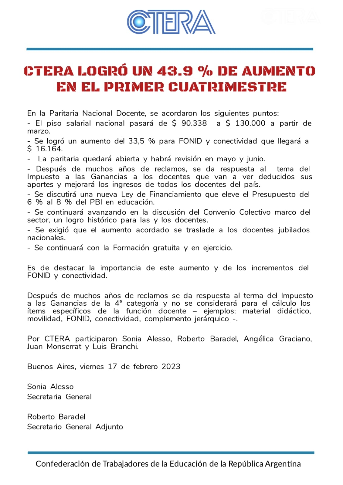 Este viernes, en una nueva reunión paritaria docente nacional, el gremio Ctera logró acordar un piso salarial de $130.000 a partir de marzo, además de un aumento de, 33,5% para FONID y conectividad que llegará a los $16.164.