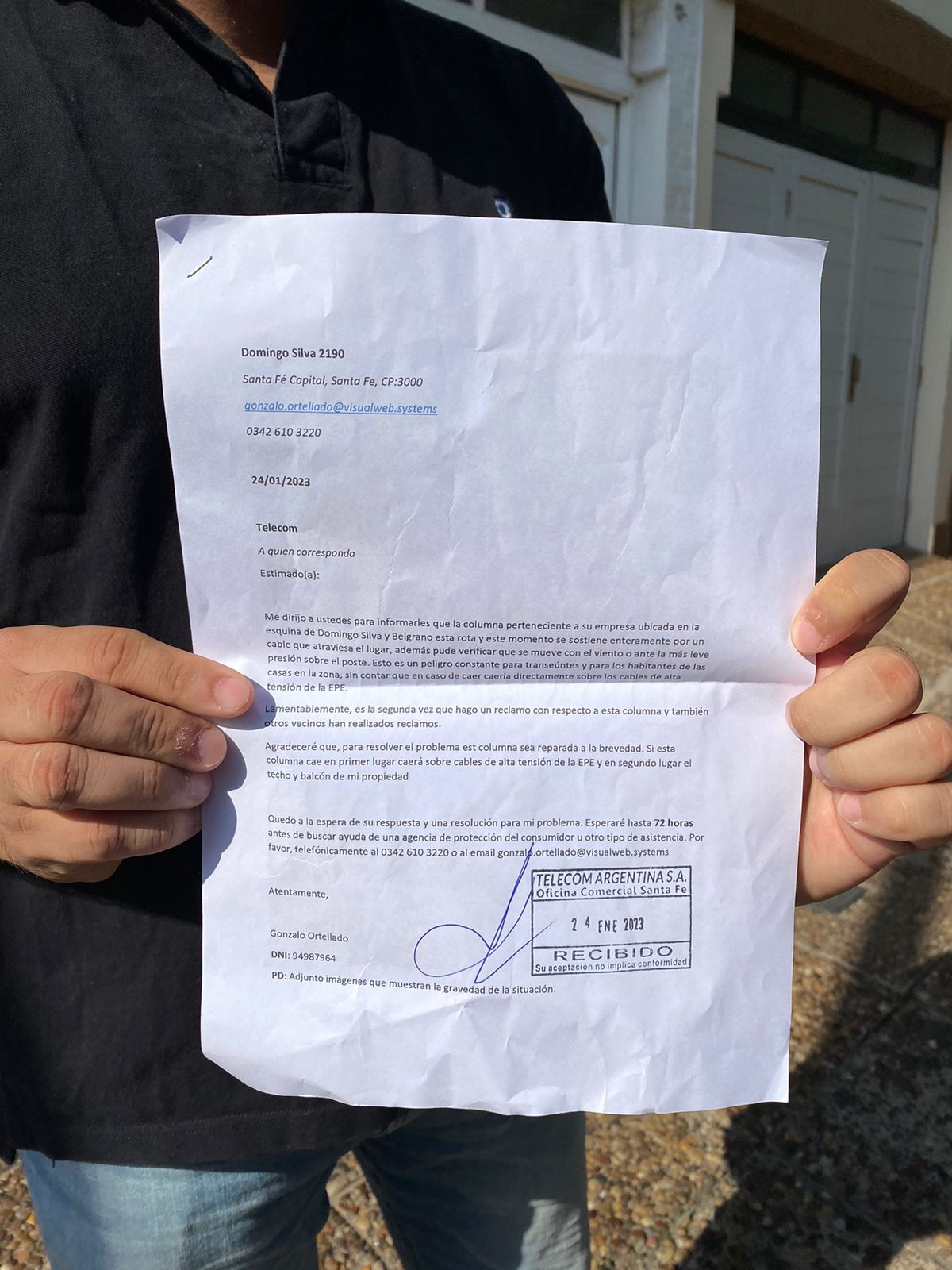 Los vecinos reclaman que nadie los escucha, en tal sentido Gonzalo, propietario de la casa que tiene el poste a punto de caerse encima, indicó en diálogo con el móvil de LT10 que en principio hicieron la denuncia al 911 y "la policía acordonó el lugar, esperaron a la municipalidad pero jamás apareció, luego fui a la Epe y me dijeron que el poste no era de ellos y fui a Telecom a realizar la denuncia, pero lo único que hicieron fue venir y colocar un hierro en la punta del poste para que no se termine de caer".