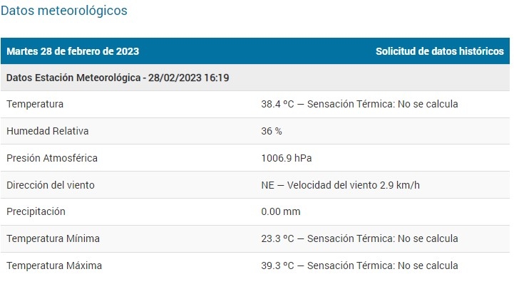 Con cielo parcialmente nublando y humedad del 37%, las condiciones de estabilidad y calor permaneceran durante el resto de la semana. Miércoles y jueves con temperaturas entre los 39 y 41 grados mientras que el viernes se espera una máxima de 34.