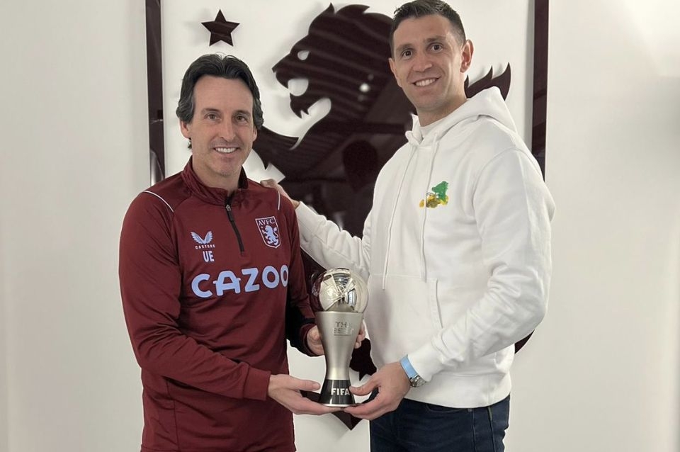 El arquero marplatense Emiliano Dibu Martínez, campeón del mundo en Qatar 2022, se reintegró al plantel de Aston Villa de Inglaterra y posó con el premio The Best junto con su entrenador, el español Unai Emery.