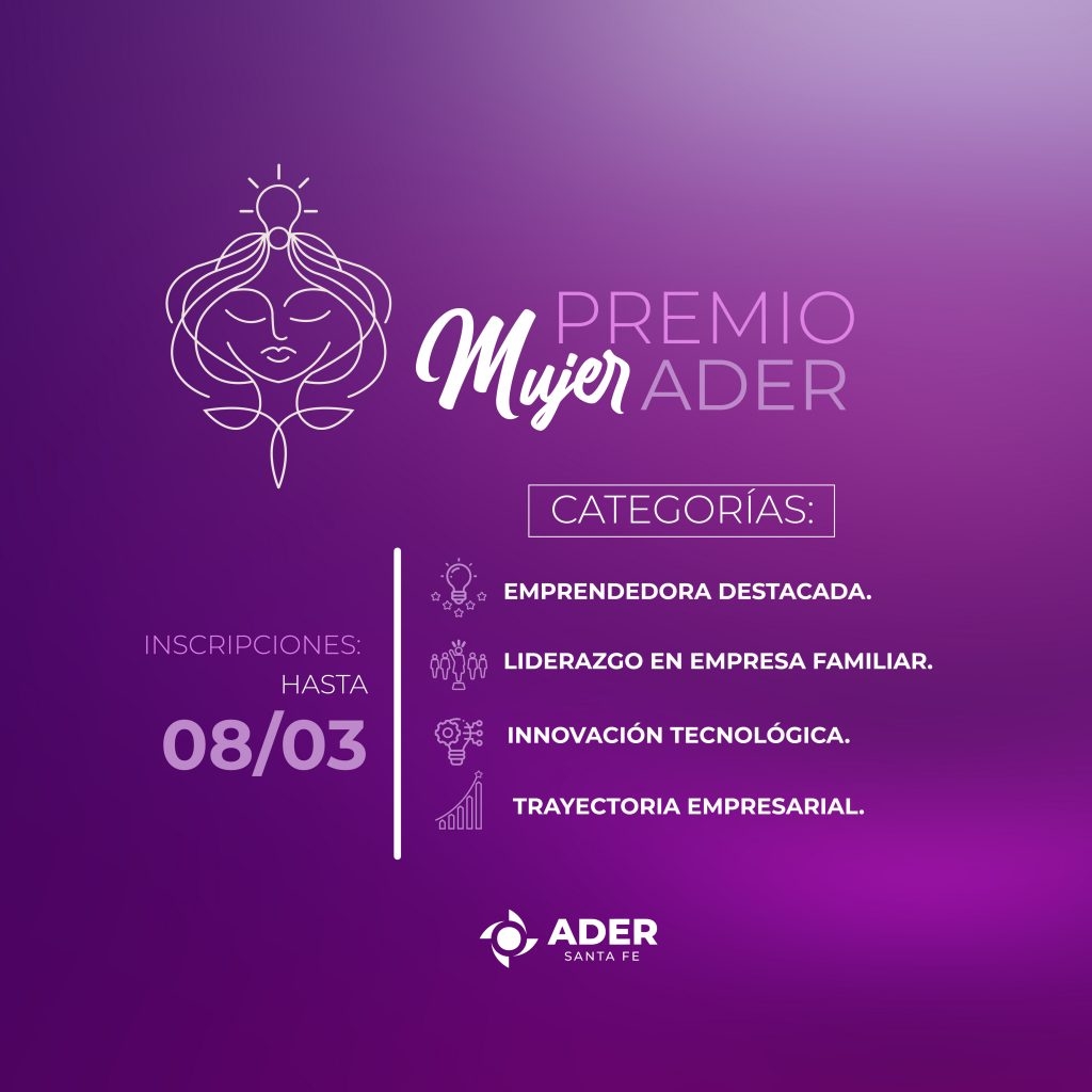 En esta oportunidad, ADER Santa Fe se propone premiar a mujeres que hayan implementado en el último tiempo, innovación tecnológica en sus PYMES, que lideren una empresa familiar, o cuenten con una trayectoria empresarial destacable por su influencia en la gremial empresaria, y/o en el impacto de su participación abriendo caminos a más mujeres, o lleven adelante un emprendimiento.