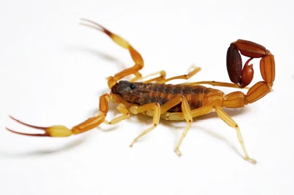 Uno de los alacranes venenosos que más produce picaduras en el país tiene pinzas finas y un doble aguijón en la cola. Es de color marrón con bandas claras.