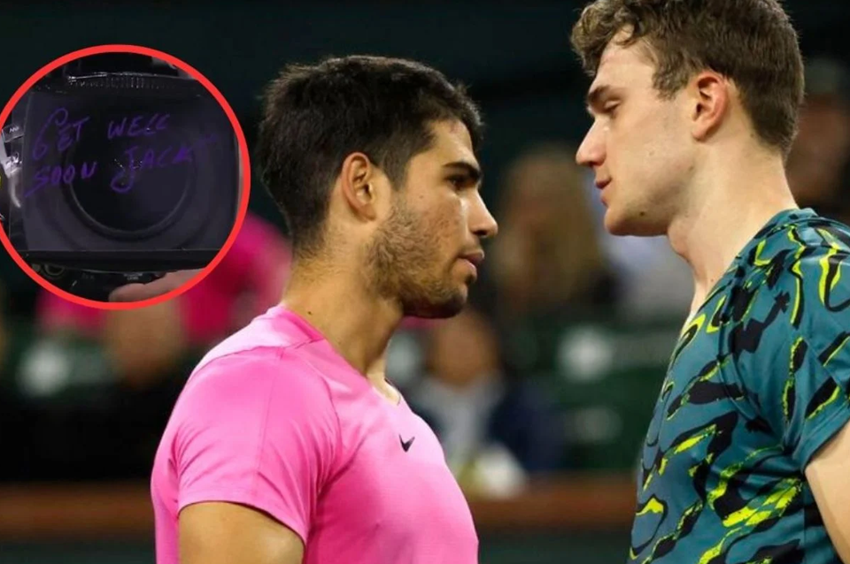 Luego de acercarse a ver cómo estaba su rival, Alcaraz hizo la típica entrevista post victoria y, en este caso, clasificación a cuartos de final de Indian Wells. En su camino hacia los vestuarios, el actual número 2 del ranking mundial dejó un mensaje muy bueno en la cámara de la televisión: "Pronta recuperación, Jack", escribió con un marcador.