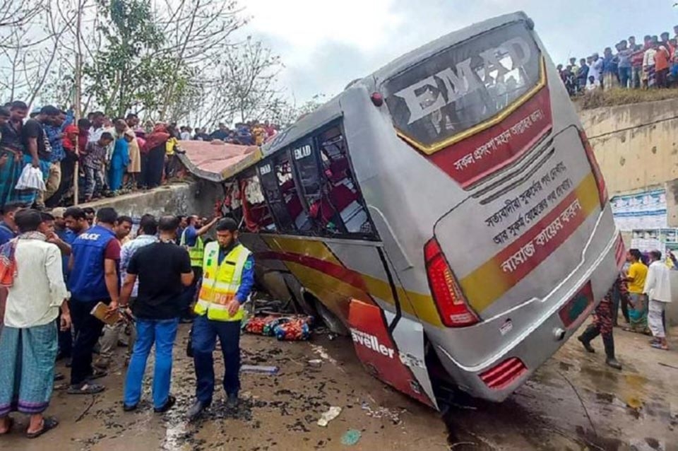 La policía dijo que sospecha de que el conductor perdió el control del ómnibus, golpeó la baranda de una autopista recién construida y cayó a una zanja de 10 metros de profundidad.