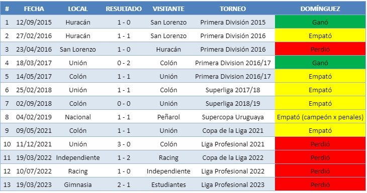 En resumen, en 13 clásico dirigidos, Eduardo Domínguez registra 2 triunfos, 6 empates y 5 derrotas