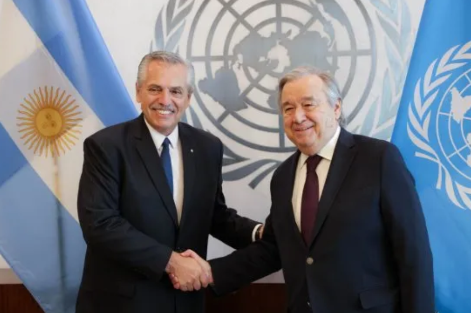 Juntos, dialogaron sobre diferentes temas de la agenda multilateral y analizaron los desafíos de la coyuntura internacional y el rol de la Argentina en ese marco. Durante el encuentro, que tuvo lugar en la sede del organismo internacional en Nueva York, el jefe de Estado reiteró la solicitud del gobierno argentino para “reanudar las negociaciones con el fin de encontrar, lo más pronto posible, una solución pacífica a la disputa de soberanía sobre la cuestión de las Islas Malvinas”.