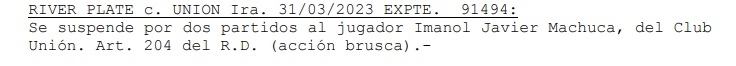 Mientras que la AFA también desestimó la gestión de la dirigencia para reducir el castigo a Mauro Luna Diale. "En cuanto a la presentación del jugador Mauro Luna Diale, del Club Unión, estése a lo resuelto con fecha 22 de Marzo de 2023", cita la resolución.