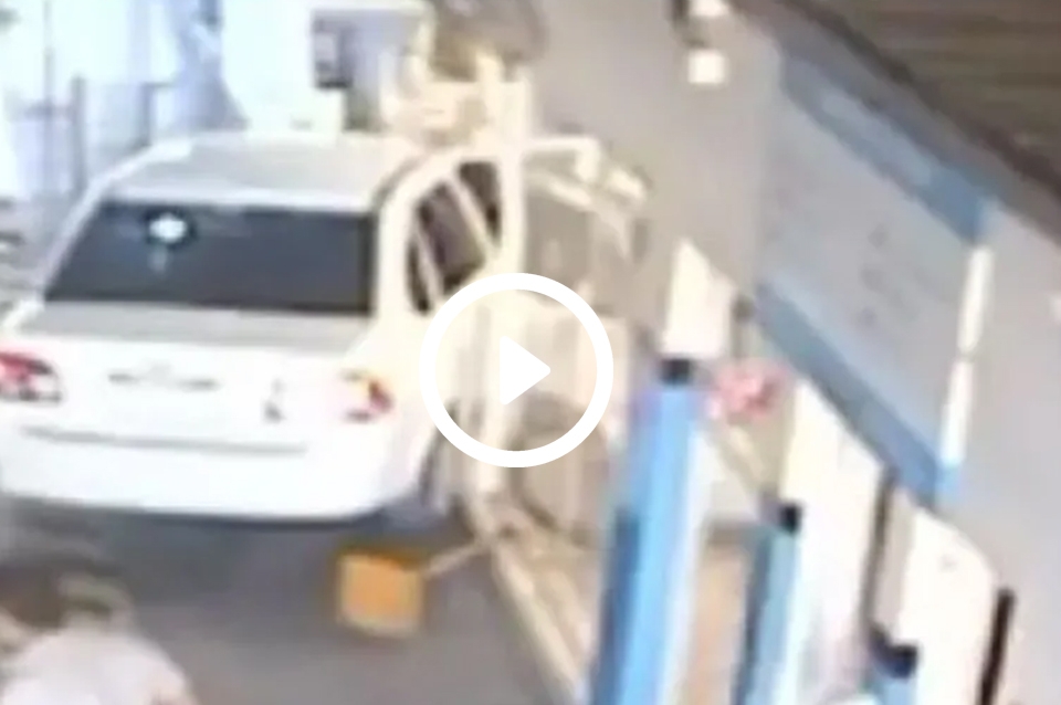 Según se puede ver en el video, el hombre intenta acomodar el auto para continuar con el chequeo, pero por motivos que se desconocen, perdió el control e impactó directamente contra las oficinas administrativas del lugar.