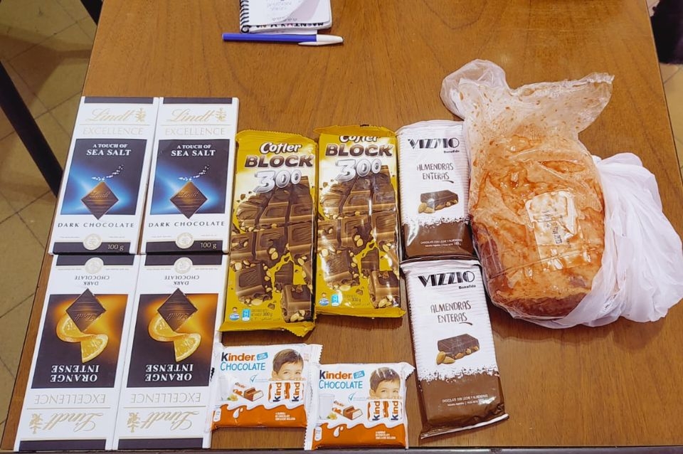 El hombre fue detenido en primer instancia por el personal de seguridad del local, y luego por la policía de la Brigada Motorizada. Al revisarlo, tenía en su poder cuatro barras de chocolate de 100gr marca Lindt, dos barras de chocolate de 300 gr marca Dofler, dos barras de chocolate de 165 gr marca Vizzio, dos barras de chocolate de 25gr marca Kinder, y una tapa de cuadril de aproximadamente 1.500kg.