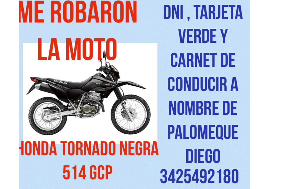 Los delincuentes se llevaron una moto Honda Tornado Negra 514 GCP y una mochila con documentación a nombre de Diego Palomeque.