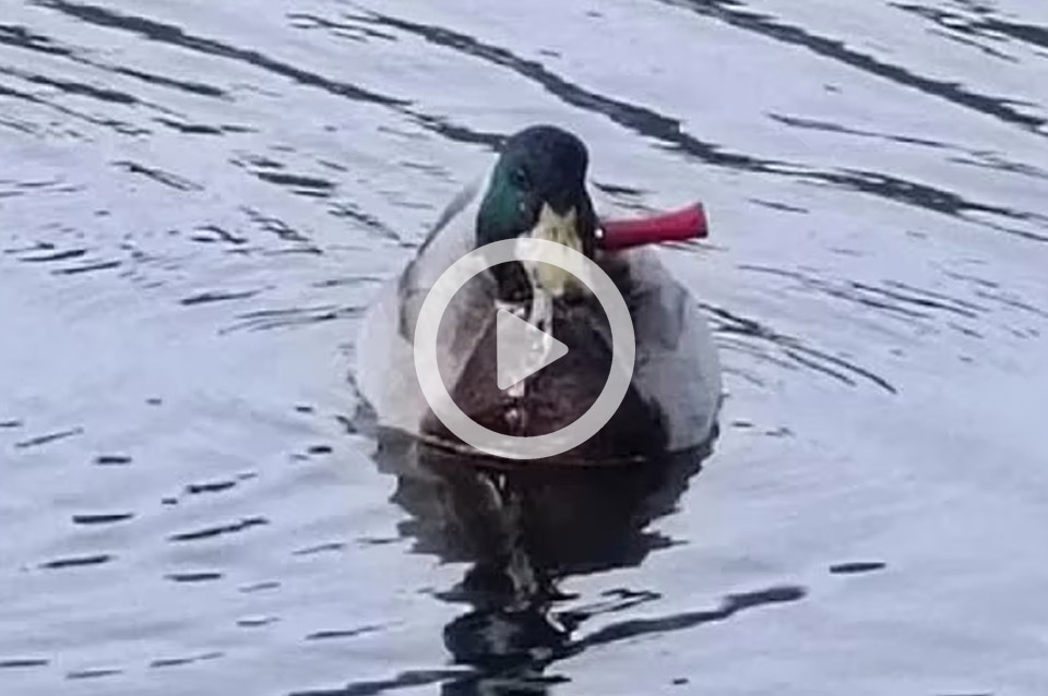 El pato salvaje que vive con un cuchillo clavado en el cuello