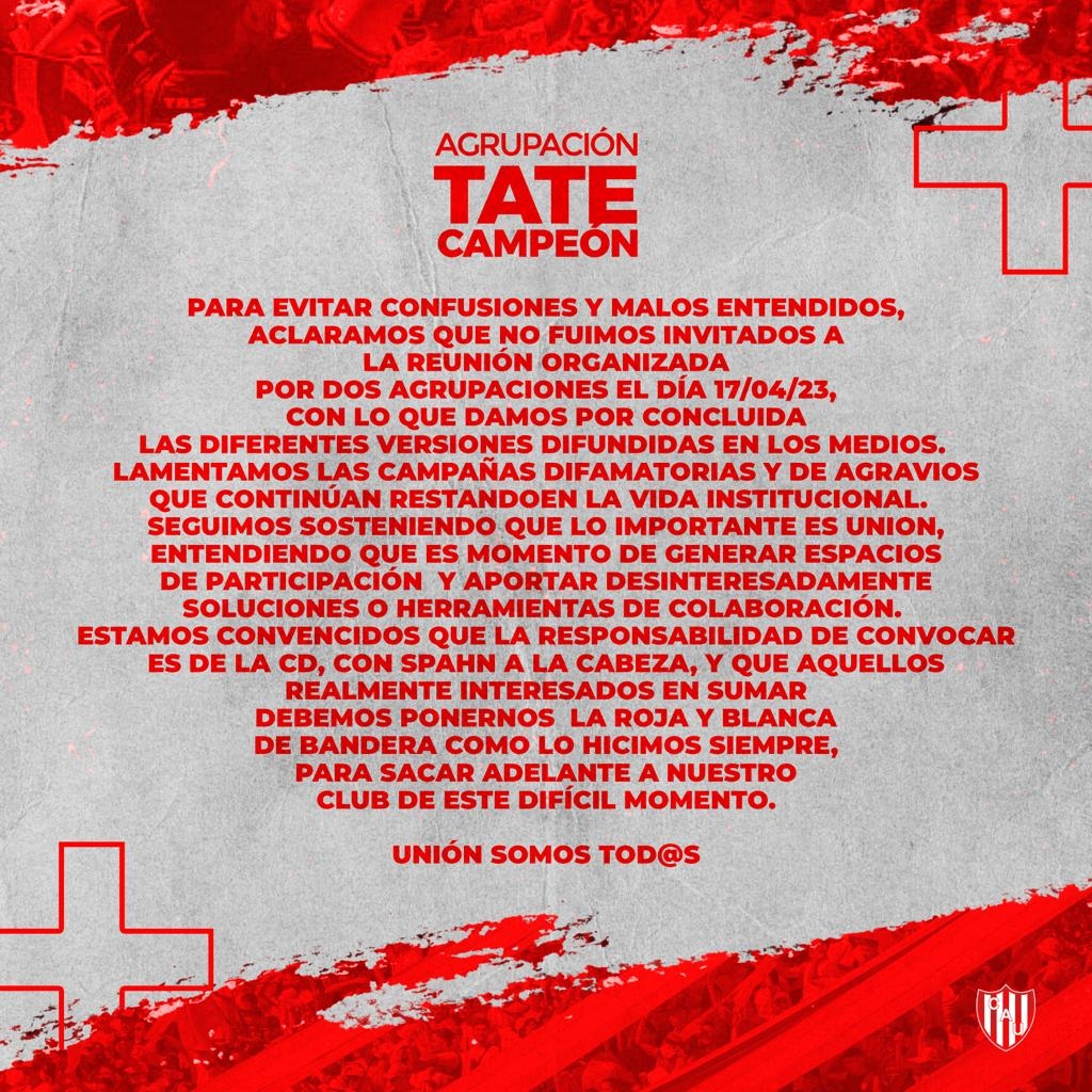 Asimismo, se pidió que la actual conducción del club debería ser la encargada de llamar al diálogo para el bien de la institución. Sobre todo, "para sacar a Unión adelante". A continuación, el comunicado: