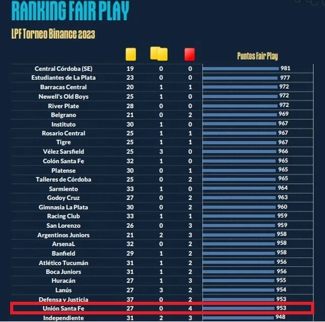Por otra parte, el club que encabeza el "juego limpio" es Central Córdoba, con 19 amonestaciones y sin expulsados. Esto cambia fecha a fecha, pero Unión sabe que todo suma y queda reflejado en este tipo de datos.