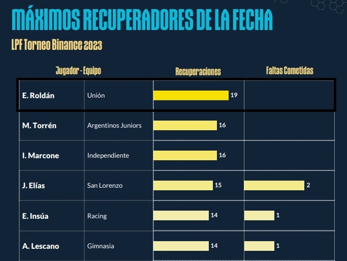 La 13ª fecha ya es historia, pero emergen varios datos a tener en cuenta. Más que nada en torno a las estadísticas que, si bien no definen nada, clarifican algunos aspectos. En este caso, un jugador de Unión fue el mayor recuperador de pelotas.