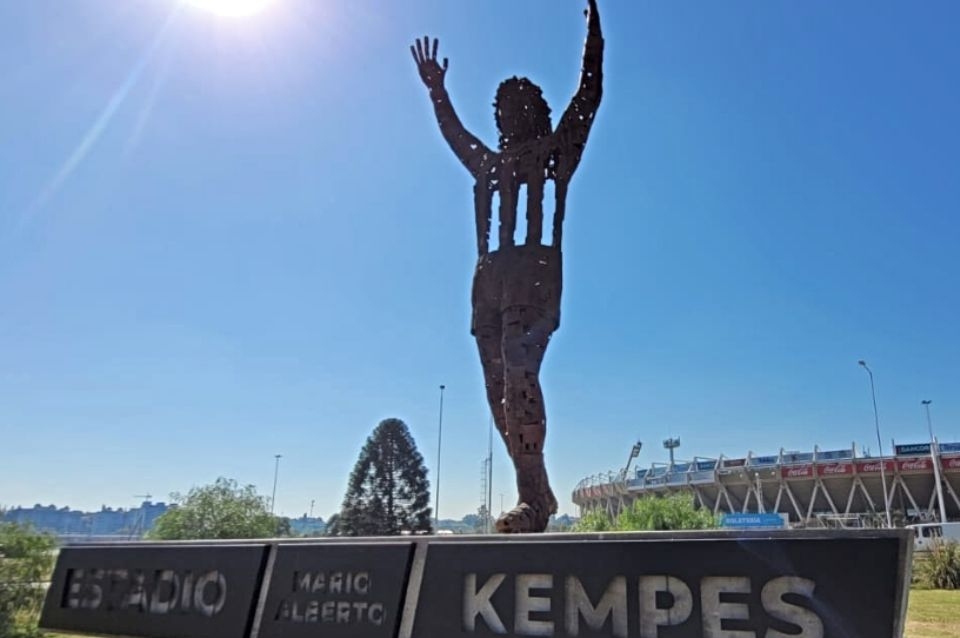 La obra artística se encuentra ubicada en una de las rotondas que conducen al ingreso sur del estadio mundialista y replica una imagen histórica del jugador nacido en Bell Ville, que evoca el festejo de gol que anotó Kempes en la final del Mundial Argentina 1978, cuando la Selección nacional obtuvo su primera Copa del Mundo dirigida por César Luis Menotti.