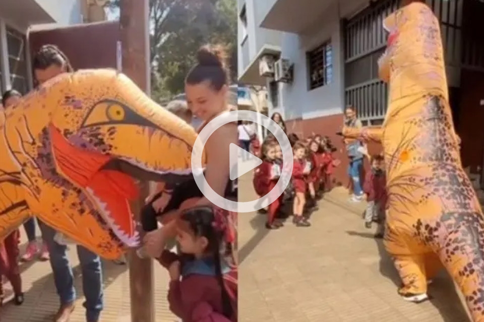En Posadas, Misiones, una abuela cumplió con el deseo de su nieto, lo fue a buscar al jardín de infantes disfrazada de dinosaurio y revolucionó la salida de los alumnos del Instituto Madre de la Misericordia.