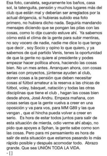 Nuevamente, con una fuerte reflexión y pidiendo unidad. Sobre todo, apuntando a los opositores: "Arranquen ahora, con cosas serias. Júntense. Ayuden al club. Con cosas serias que la gente vuelva a creer en la oposición. Va para vos MM (Marcelo Martín de Tate Campeón), Glorioso 89 de Carlos Ghisolfo, y las que vengan".