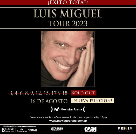 El “Luis Miguel Tour 2023” es un éxito total en el país. El artista mexicano logró un sold out en las 9 funciones que se llevarán a cabo el 3, 4, 6, 8, 9, 12, 15, 17 y 18 de agosto en el Movistar Arena de Buenos Aires. Tras el furor de su llegada a la Argentina, el intérprete de 'La Incondicional' sumó una nueva fecha para el miércoles 16 de agosto.