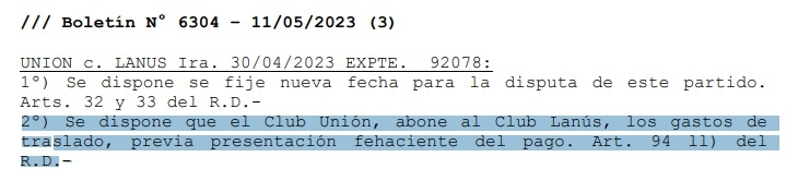Por ahora no hay una fecha sobre cuándo se disputará, pero se está en tema de estudio. Pero claramente esto no iba a quedar en la nada y la AFA fue al hueso, quizás también sustentado en un reclamo el club del sur del gran Buen Aires. "Se dispone que el Club Unión, abone al Club Lanús, los gastos de traslado, previa presentación fehaciente del pago. Art. 94 ll) del R.D".