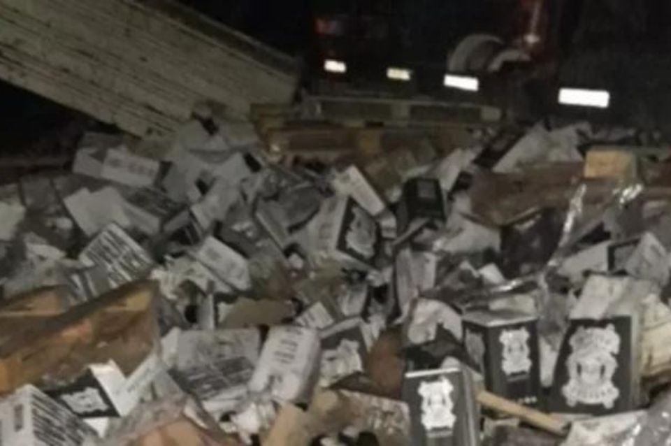 En consecuencia, el vehículo de gran porte quedó obstruyendo la calzada y volcó toda su carga: cajas de vino.
