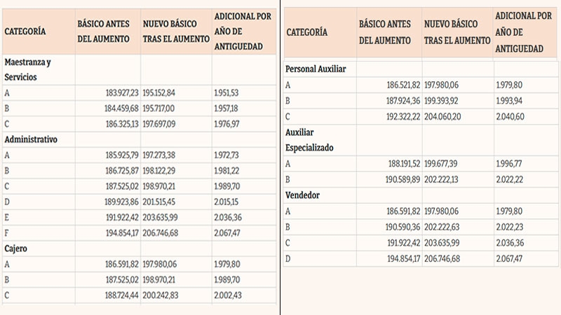 El segundo tramo de los aumentos, de 6,5%, se percibirá en los salarios de junio 2023. De este modo, las escalas salariales quedan así: