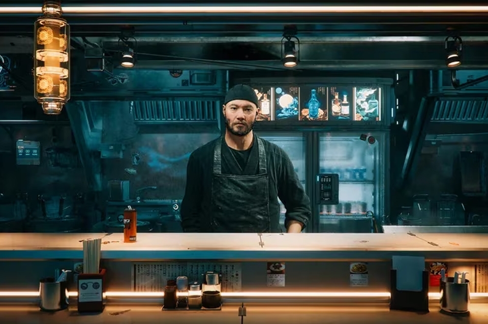 La escena generada es en la que un jugador, tomando el papel de Kai, ingresa a un restaurante futurista y se encuentra con Jin, el dueño del lugar. El jugador inicia la conversación y el NPC empieza a responderle de forma coherente para luego asignarle una misión.