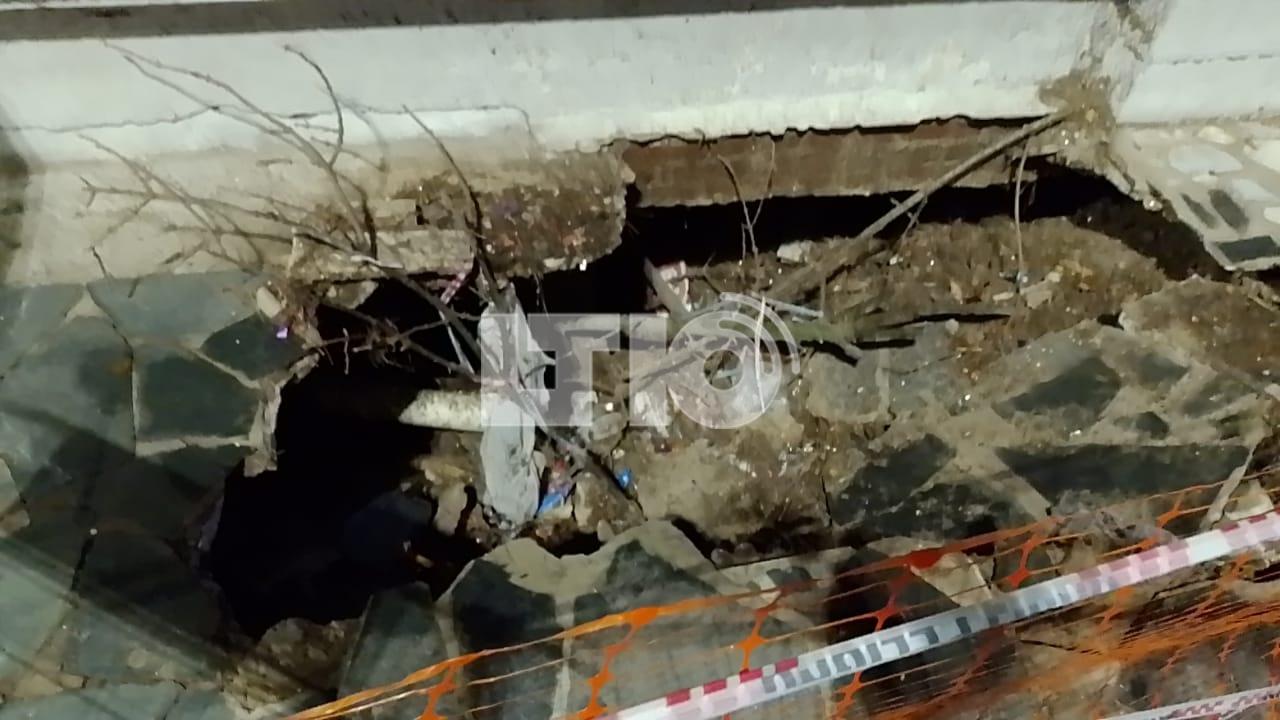 Allí se puede ver que cedió el asfalto y se hizo un gran pozo. Además, se pueden ver rajaduras e incluso que está descalzada una parte de la mampostería.