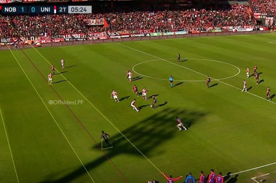 Brian Aguirre se escapó por la banda derecha y consiguió marcar el 2-0 ante Santiago Mele y el resto de la defensa del cuadro Tatengue. Sin embargo, el asistente había levantado el banderín por offside y lo anuló. Desde ahí, Mauro Vigliano en el VAR comenzó a trazar la línea y, curiosamente se dio una situación similar al tanto de Darío Benedetto durante el sábado.