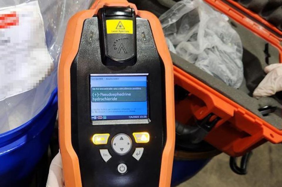 Luego, el test de campo practicado sobre la mercadería por personal especializado del organismo confirmó que se trataba de clorhidrato de pseudoefedrina, que al igual que la efedrina, puede ser utilizado para la síntesis de metanfetamina.