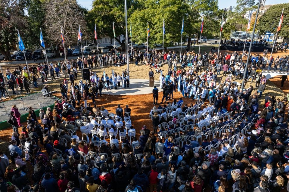 Allí reunidos, los alumnos de las escuelas N° 2 “Manuel Belgrano”, N°6 “Mariano Moreno”, N° 7 “Presidente Beleno”, N° 13 “Dalmacio Vélez Sarfield”, N° 27 “José Gálvez”, N° 42 “Gregorio Las Heras”, N° 1109 “Hipólito Yirigoyen”, N° 1190 “4° Centenario”, N° 1255 “Malvinas Argentinas”, y N° 6385 “Adelia Di Carlo”, prometieron lealtad a la Bandera Nacional. Fue el intendente Jatón quien les tomó el juramento.