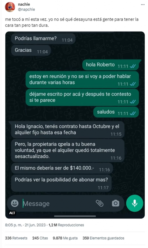 “Yo no sé qué desayuna esta gente para tener la cara tan, pero tan dura”, fue la reacción del joven al publicar a través de su cuenta de Twitter, la conversación que mantuvo vía WhatsApp, con la representante de la inmobiliaria.
