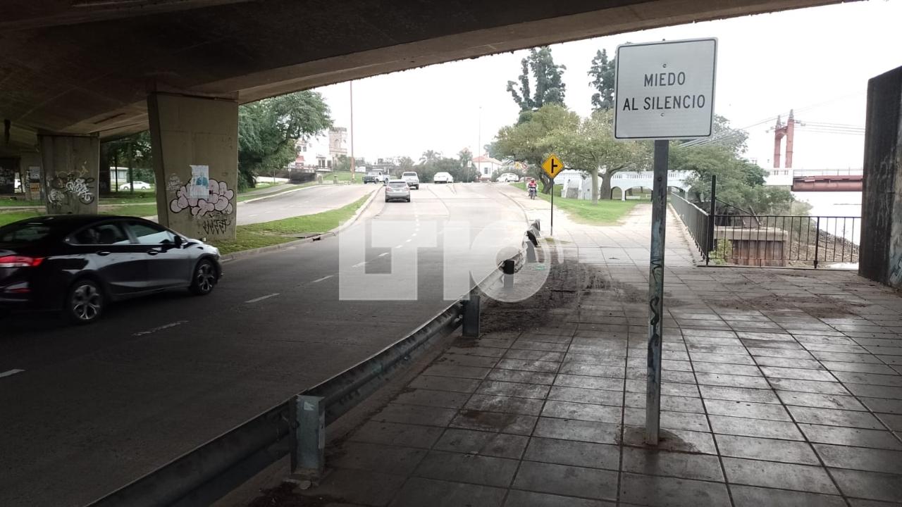 En los últimos días, un extraño cartel llama la atención de quienes circulan a diario por el camino que pasa por debajo del Puente Oroño.