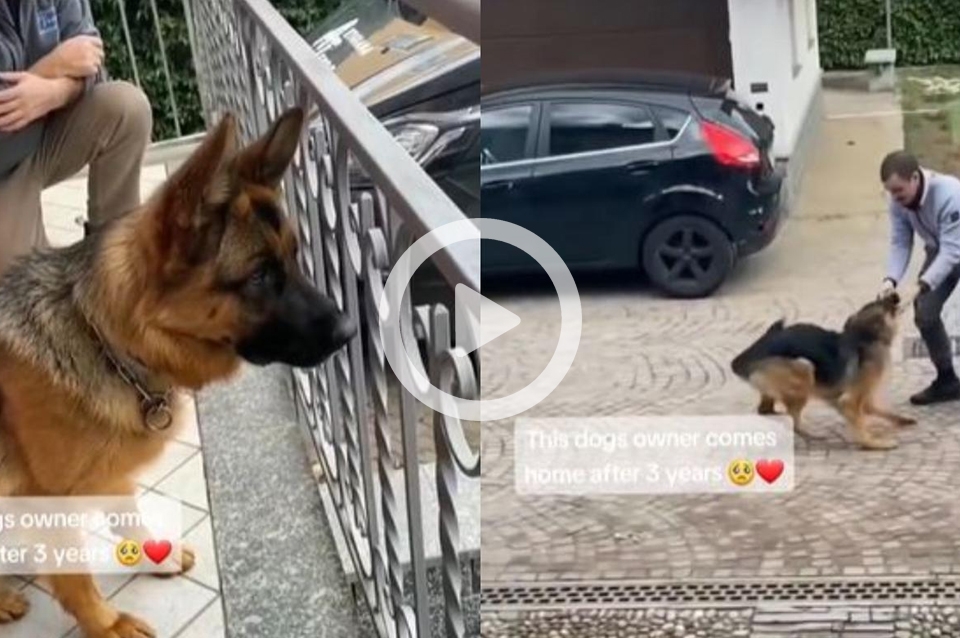 En el posteo, se puede observar el emotivo reencuentro entre un perro y su dueño luego de tres años sin verse. Según se aprecia en las imágenes, el animal de raza pastor alemán se encuentra tras las rejas de una casa y con las orejas alzadas, en una clara señal de expectativa por lo que se podía avecinar.