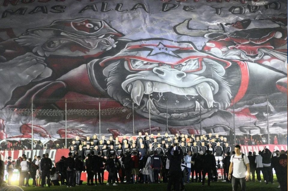 La bandera en cuestión tenía la leyenda “Nosotros estamos más allá de todo”, con las caricaturas de un mono, un pollo y un toro, en probable alusión a los apodos de Guille Cantero, Leandro Vinardi y Carlos Escobar, los tres presos como miembros del clan conocido como Los Monos.