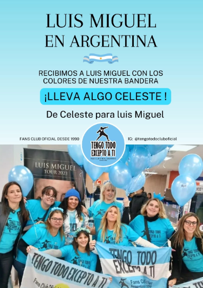 "Hagamos juntos una bienvenida bien ARGENTA!! 👗 Remera celeste +bandera Argentina + Gorros celestes + Porras celestes + Globos celestes, luces celestes y todo lo que se te ocurra que sea celeste", reza el posteo de las fanáticas, que ya habían propuesto esta consigna durante la última visita de Luismi en 2019.