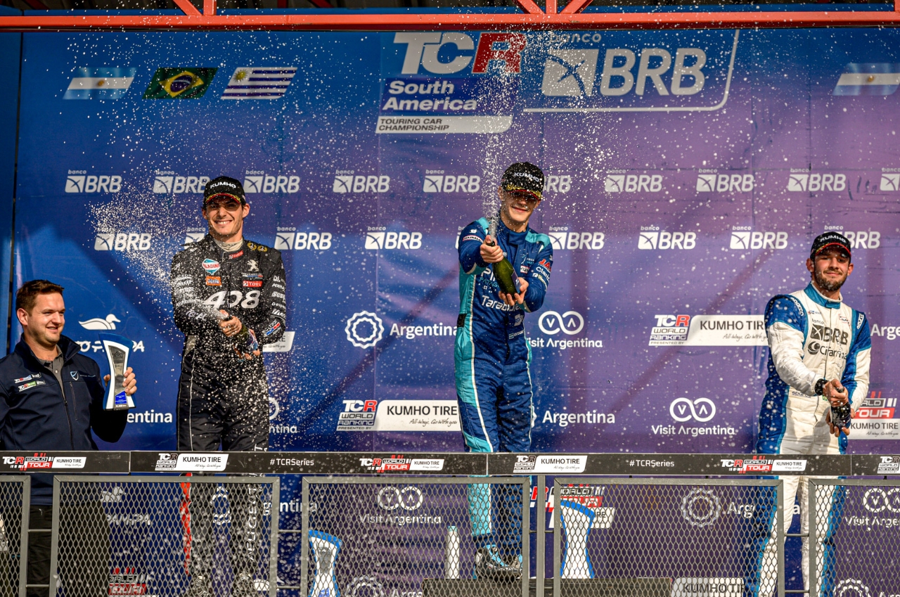 En la primera vuelta la competencia del TCR South America tuvo varios cambios de posiciones y roces que involucraron a Juan Manuel Casella el uruguayo que fue penalizado y del sexto lugar cayo al decimo en la clasiificacion final por el toque con el brasileño Galid Osman, y excluido de la carrera el uruguayo Enrique Maglione, protagonista tambien del toque ren la primera vuelta con los dos Toyota del equipo de Victor Rosso, que tras el incidente de la largada los vio abandonar a Fabian Yannantuoni y Juan Angel Rosso sin apenas cumplir la primera vuelta de la carrera 1, y Rafael Suzuki por no respetar el regimen de Parque Cerrado.