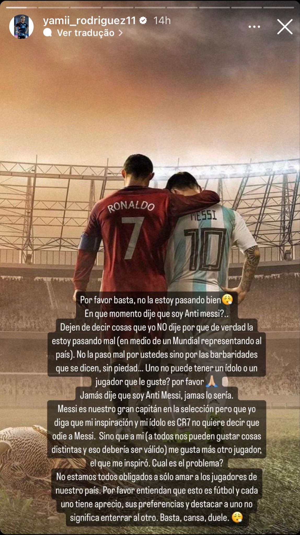 "Por favor, basta; no la estoy pasando bien. ¿En qué momento dije que soy anti-Messi? Dejen de decir cosas que yo no dije porque de verdad la estoy pasando mal (en medio de un Mundial representando al país). No la paso mal por ustedes sino por las barbaridades que se dicen, sin piedad. ¿Uno no puede tener un ídolo o un jugador que le guste? Por favor", escribió la jugadora del Palmeiras en sus cuentas de Instagram y Twitter.