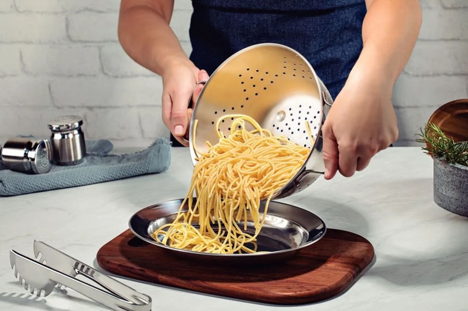 Solo hay una forma: con un colador que se adapte al tamaño de tu cacerola de manera que se ajuste y no deje huecos laterales por los que se cuele la pasta. No hace falta tener un colador por cacerola, pero sí al menos un modelo que se adapte perfectamente a aquella que más uses para hacer pastas o caldos.