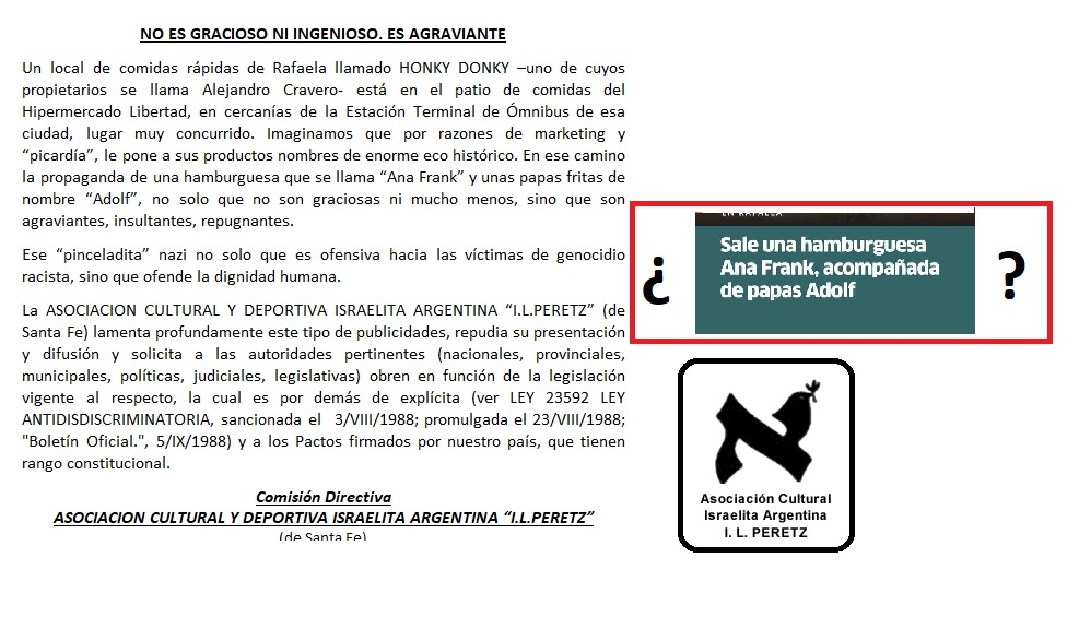 Desde la Asociación Cultural y Deportiva Israelita Argentina “I.L. Peretz” emitieron un comunicado el cual titularon “No es gracioso ni ingenioso. Es agravante” en cual repudiaron la acción del local gastronómico que se encuentra dentro del Hipermercado Libertad, en cercanías de la Estación de Ómnibus de la ciudad de Rafaela.