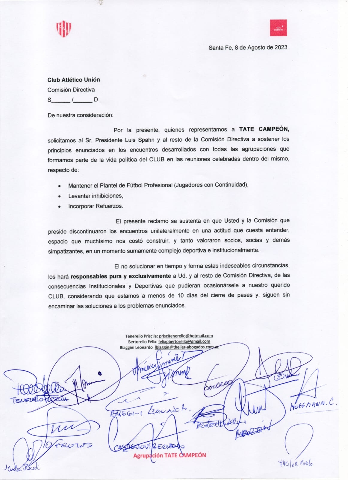 Tate Campeón, agrupación liderada por Marcelo Martín, lanzó un comunicado que reza lo siguiente: "Por la presente, quienes representamos a TATE CAMPEÓN, solicitamos al Sr. Presidente Luis Spahn y al resto de la Comisión Directiva a sostener los principios enunciados en los encuentros desarrollados con todas las agrupaciones que formamos parte de la vida política del CLUB en las reuniones celebradas dentro del mismo: Mantener el Plantel de Fútbol Profesional (Jugadores con Continuidad), levantar inhibiciones e incorporar refuerzos".