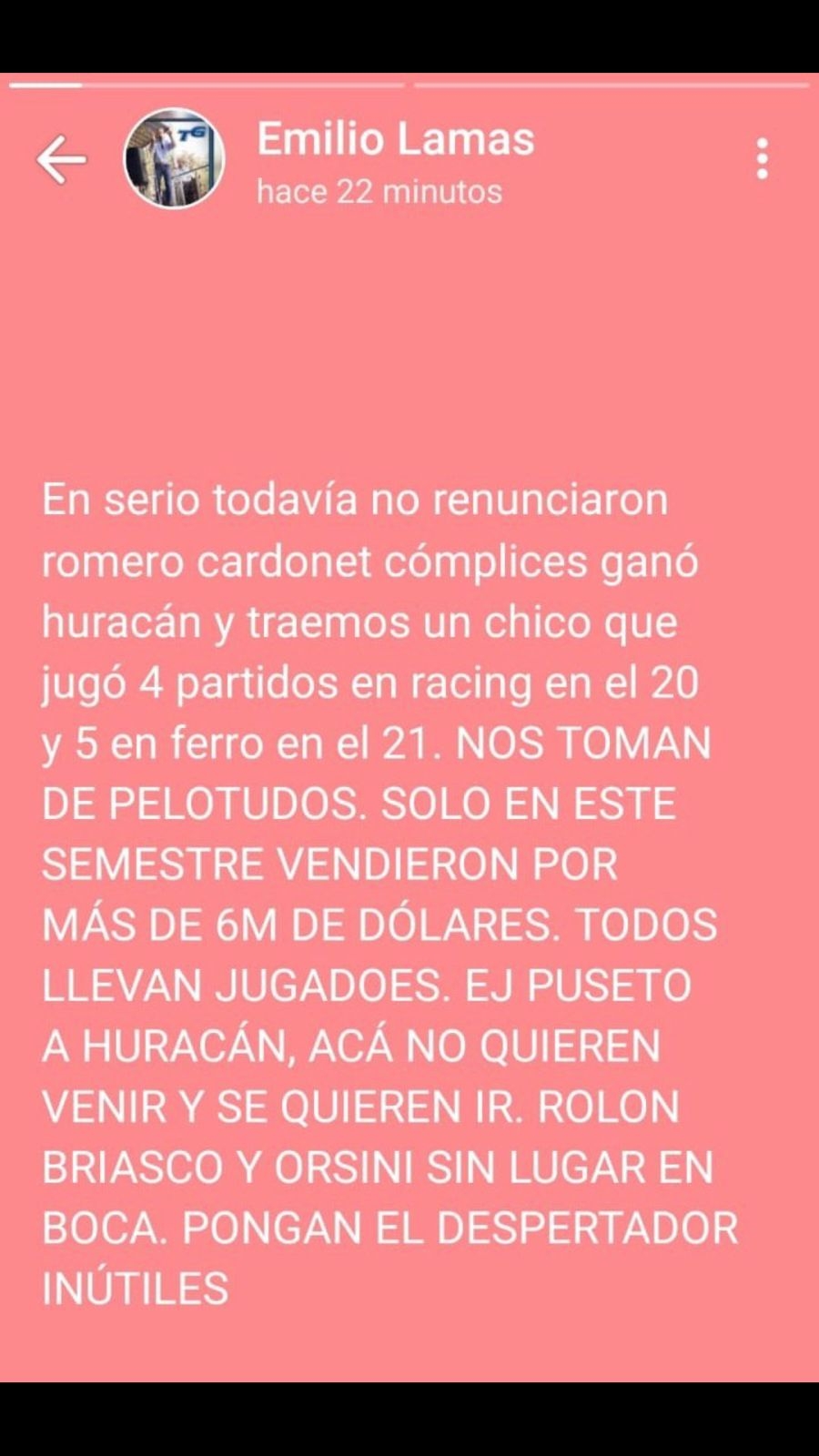 En una historia de WhatsApp, escribió: "En serio todavía no renunciaron Romero, Cardonet, cómplices. Ganó Huracán y traemos un chico que jugó cuatro partidos en Racing en el 2020 y 5 en Ferro en el 2021. NOS TOMAN DE PELOTUDOS. SOLO EN ESTE SEMESTRE VENDIERON POR MÁS DE 6M DE DÓLARES. TODOS LLEVAN JUGADORES, EJEMPLO PUSETTO A HURACÁN".